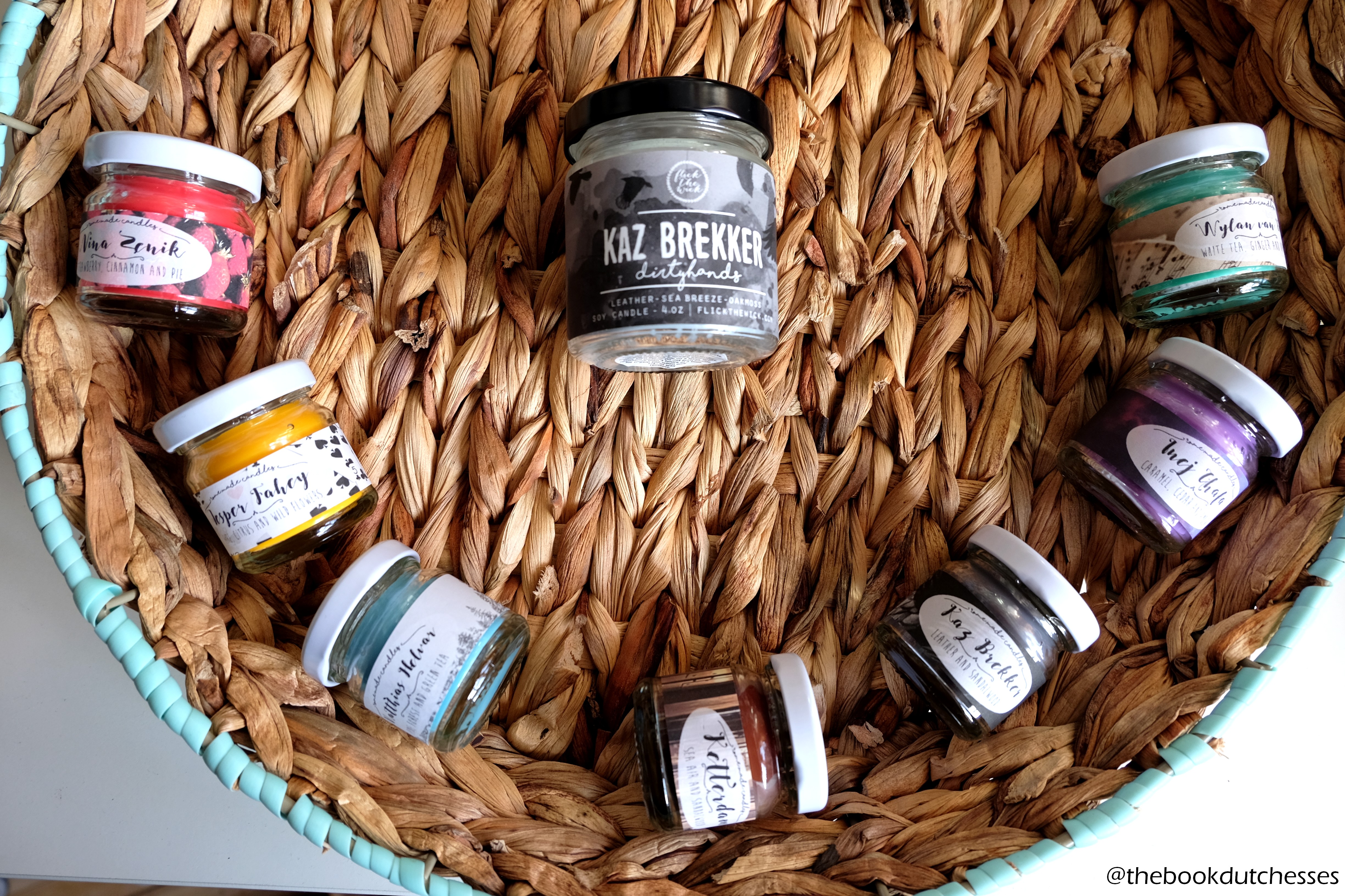 The first Six of Crows candle I got is the small brown one, ‘Ketterdam’. This is one from Romemadecandles, I got 4 different places from her and Ketterdam was one of them. I was so happy to find a Six of Crows related item. Romemadecandles is a Dutch company which makes the shipping quite doable. She also got really cute boxes with (usually) 4 candles inside. The candles are quite small but that way you can get more 😀 I’m really careful with lighting them so I don’t mind that these are small. They look super cute on my shelves and are great value for money.